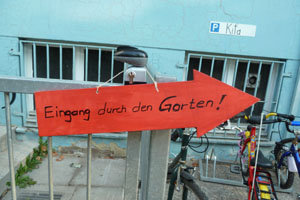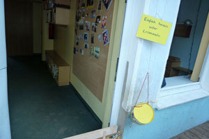 Die Eingangstür ist durch einen elektrischen Türöffner gesichert. Für die Kinder war daher von Anfang klar, durch die Tür kann am Tag ohne Strom keiner gehen. Die Menschen müssen den Eingang über den Garten nehmen. Dieser Eingang wird dann durch ein Kind gesichert, damit niemand ungesehen in die Einrichtung geht und statt einer Klingel, gibt es eine Trommel. Natürlich müssen diese Neuerungen durch Schilder bekannt gegeben werden.