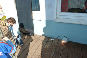 - Christiane und einige Kinder waschen das schmutzige Geschirr auf der Balustrade in der frischen Luft ab. Das heiße Abwaschwasser kommt wieder aus der Solardusche und dem Gaskocher.