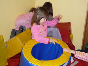 Bewegungsmöglichkeiten gibt es in allen Räumen, sei es an der Staffelei, an dem ein Kind mit ganzem Körpereinsatz malen kann, im Rückzugsraum in der Hängematte oder sei es auf dem Rollbrett durch den Flur sausend. Im Bewegungsraum können die Kinder schaukeln, klettern, springen, werfen, kriechen, rutschen und sich an der Sprossenwand hochziehen.